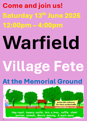 If you would like to get involved and help to sponsor the Warfield Village Fete please get in touch at WarfieldFete@outlook.com